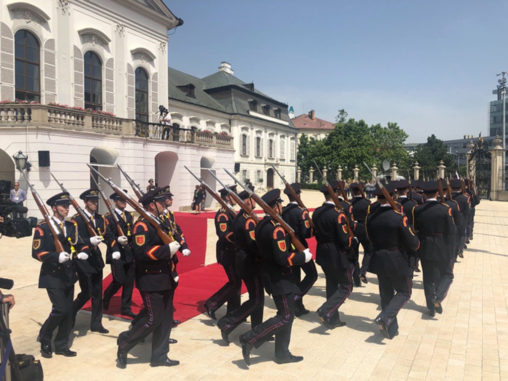 14.25 - Kým Zuzana Čaputová bola na ekumenickej bohoslužbe, členovia Čestnej stráže sa pred Prezidentským palácom pripravovali na jej príchod.