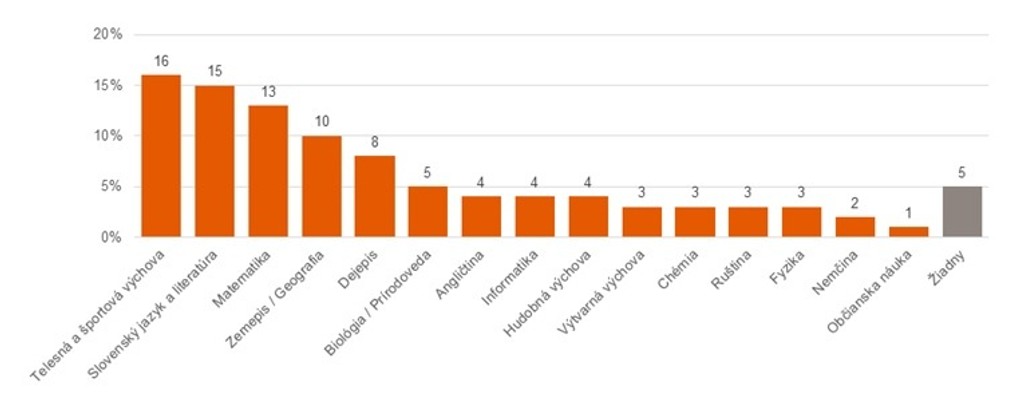 Najobľúbenjším predmetom je tak podľa prieskumu telesná výchova (16%). Potom nasledoval slovenský jazyk a literatúra (15%) a ako tretia najobľúbejšia je matematika (13%).