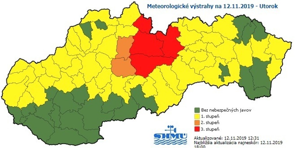 Výstraha platí pre okresy Tvrdošín, Liptovský Mikuláš, Poprad a Brezno. Upozorňuje na to Slovenský hydrometeorologický ústav (SHMÚ). Výstrahy sú vyhlásené na utorok, stredu (13. 11.) a štvrtok (14. 11.).