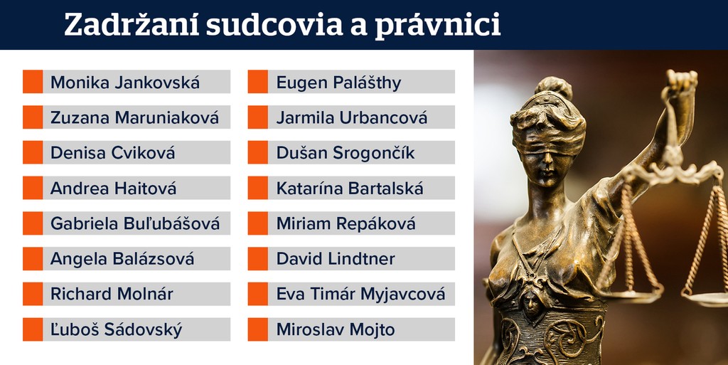 Boli medzi nimi traja civili a piati bratislavskí sudcovia, ktorých na súd priviezli okolo poludnia. Ide o bývalú štátnu tajomníčku ministerstva spravodlivosti Moniku Jankovskú, ďalej Zuzanu Maruniakovú, Denisu Cvikovú, Eugena Palášthyho a Richarda Molnára.