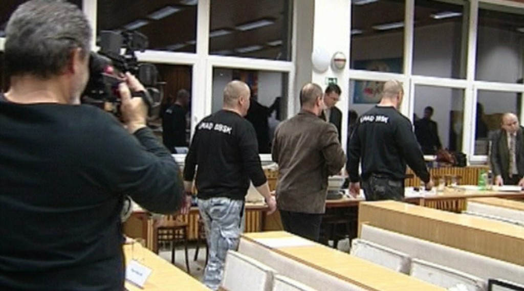 Jelšava, prvé rokovanie krajských poslancov so županom Mariánom Kotlebom. Vstup do miestnosti strážia ostrí chlapci. Medzi nimi županov brat Marek.