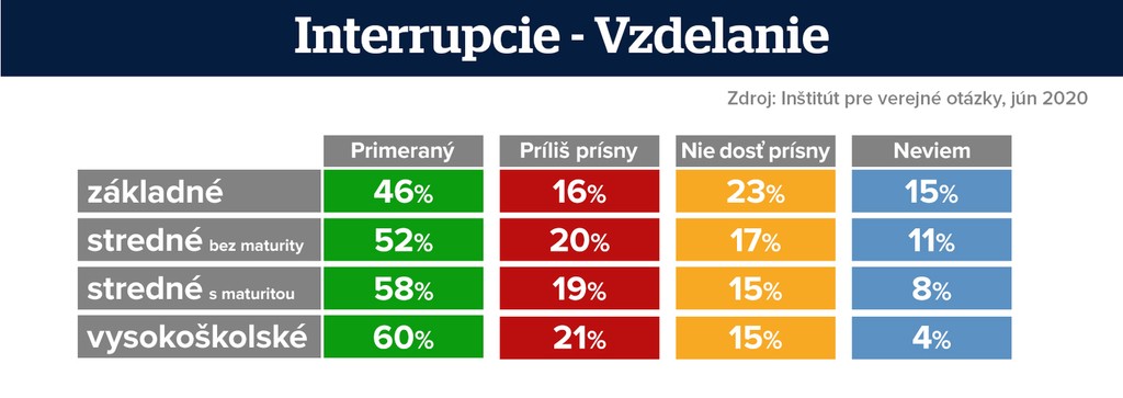 Najviac žien a mužov, ktorí sa nevedeli k téme vyjadriť, je v najmladšej vekovej skupine (18-24 rokov). S rastúcim vzdelaním sa mierne zvyšuje podpora zachovania terajšej podoby interrupčného zákona a klesá podpora jeho sprísnenia. Znižuje sa aj podiel žien i mužov, ktorí nevedia zaujať stanovisko.
