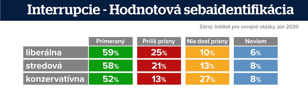 Za zachovanie dnešnej podoby interrupčnej legislatívy sa prihovára nielen väčšina ľudí, ktorí sa cítia byť liberáli (59%), ale aj väčšina tých, ktorým je bližšia konzervatívna orientácia (52%). Požiadavku sprísniť interrupčný zákon vyjadrilo iba desať percent liberálne cítiacich ľudí a 27 percent konzervatívne orientovaných.