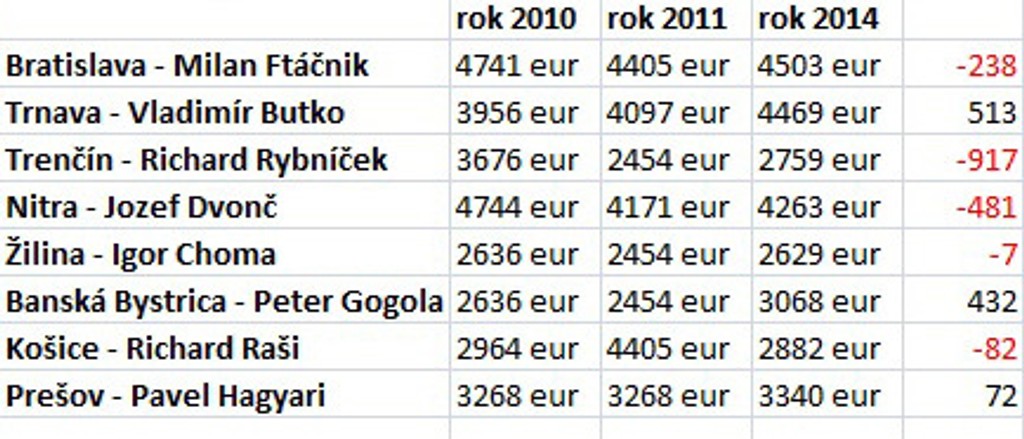 Sledovanou témou boli v uplynulom volebnom období platy primátorov, pretože šéfovia samospráv každý mesiac dostávajú na účet aj tisíce eur. Zároveň však platí, že piati z ôsmich šéfov krajských miest zarábajú menej než pred štyrmi rokmi.