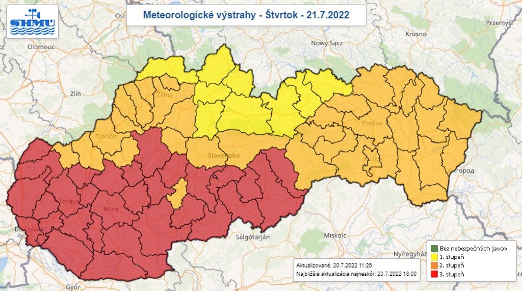 Slovenský hydrometeorologický ústav (SHMÚ) už rozšíril výstrahy tretieho stupňa pred teplom aj na ďalšie okresy. Začnú platiť o 13.00 h a potrvajú do 18.00 h, čo sa ešte môže v priebehu najbližších hodín zmeniť.