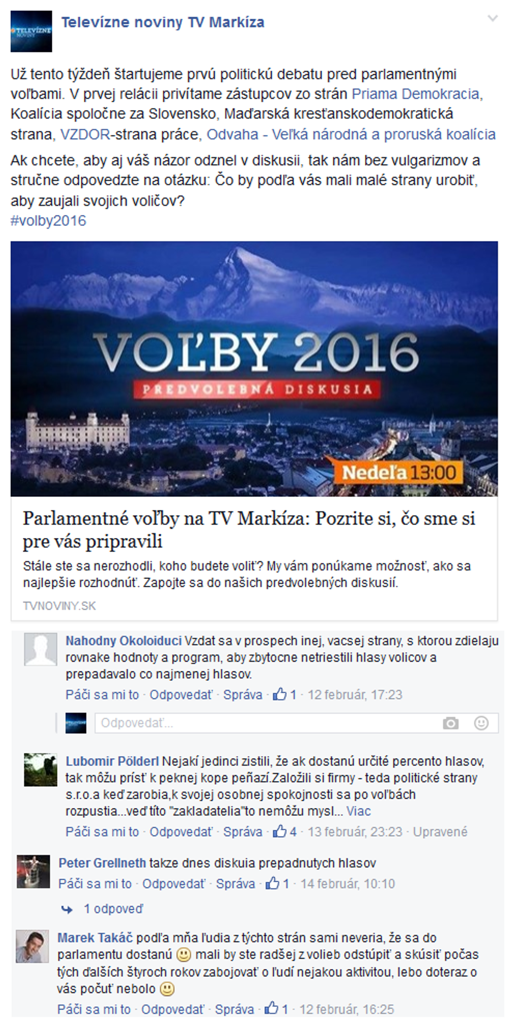 V sobotu (20.2.) o 13.00 hod. sa môžete tešiť na zástupcov strán Strana moderného Slovenska, Demokrati Slovenska - Ľudo Kaník, Strana zelených Slovenska a TIP. V nedeľu (21.2.) zas do štúdia zavítajú lídri strán Komunistická strana Slovenska, Šanca, Kotleba - Ľudová strana naše Slovensko a SKOK.