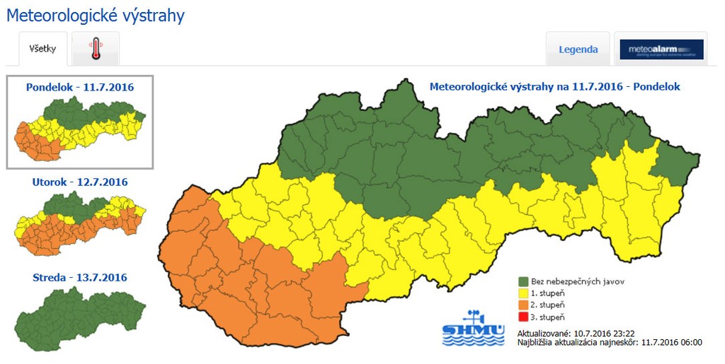 Výstraha druhého stupňa platí dnes pre Bratislavský, Nitriansky a Trnavský kraj. Teplota vzduchu tam môže vystúpiť na 35 stupňov Celzia. Pre Banskobystrický, Trenčiansky, Košický a Prešovský kraj platia výstrahy prvého stupňa. Počas dňa by tam malo byť 33 až 34 stupňov Celzia. Vysoké teploty by mali ustať večer. Bez výstrah bude len sever a časť stredného Slovenska.