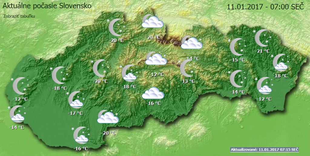 Dnešné ranné teploty sú naozaj kruté. V Bratislave je -14 stupňov, v Piešťanoch -18, v Dudinciach aj v Prievidzi až - 20 stupňov. Najchladnejšie ráno mali ľudia v Stropkove. Teplomery ukazujú -21 stupňov.