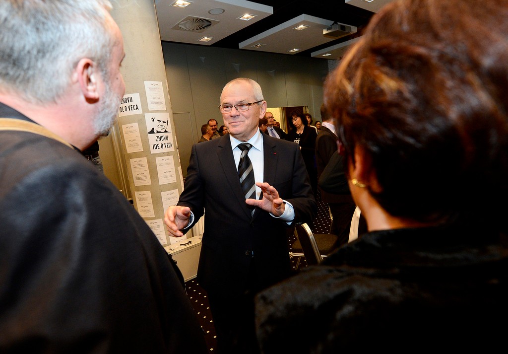 Z dvesto pozvaných hostí je v priestrannej konferenčnej sále prítomná už zhruba polovica. Po Kňažkovi sa hosťom prihovoril hudobník Laco Lučenič, ktorý kandidáta sprevádzal počas jeho volebnej kampane.