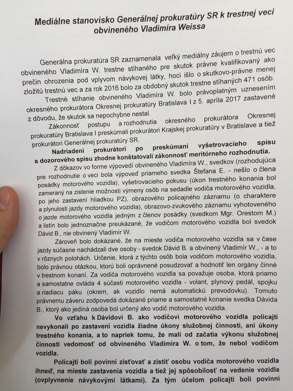 Nadriadení prokurátori po preskúmaní vyšetrovacieho spisu a dozorového materiálu zhodne konštatovali zákonnosť meritórneho rozhodnutia. Uvádza sa to v stanovisku GP SR. GP SR mala od prvej polovice apríla k dispozícii vyšetrovací spis futbalového reprezentanta Vladimíra Weissa mladšieho.