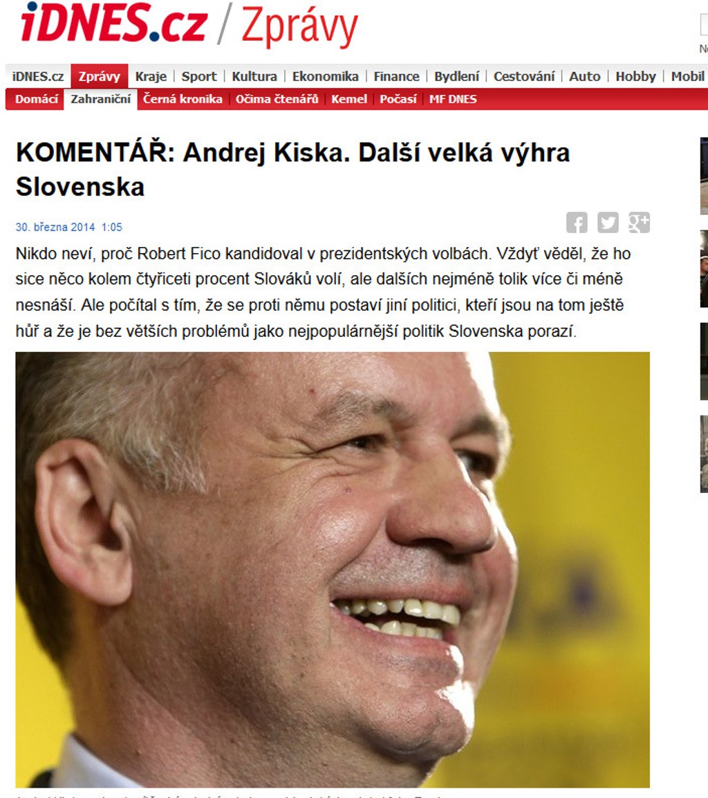 Český spravodajský portál iDNES.cz rovnako píše, že Ficovi nepomohla ani tvrdá osobná kampaň proti Kiskovi, ani podpora všetkých troch bývalých prezidentov či časti katolíckeho duchovenstva. Výraznú prehru Fica, ktorý bol posledných desať rokov najsilnejším politikom na Slovenska, pritom označil za "veľmi tvrdú ranu" pre premiéra. Kiska podľa iDNES.cz vyhral práve z dôvodu "naštvanosti Slovákov na tradičných politikov".
