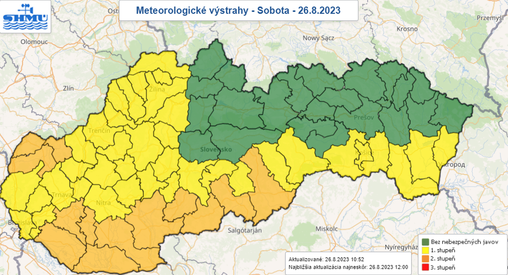 Pre okresy takmer celého Bratislavského, Banskobystrického, Košického kraja vydali výstrahu prvého stupňa. Taktiež aj pre okresy Partizánske, Nitra, Topoľčany, Zlaté Moravce, Hlohovec, Piešťany a Trnava. SHMÚ očakáva miestami 33 až 34 stupňov Celzia.