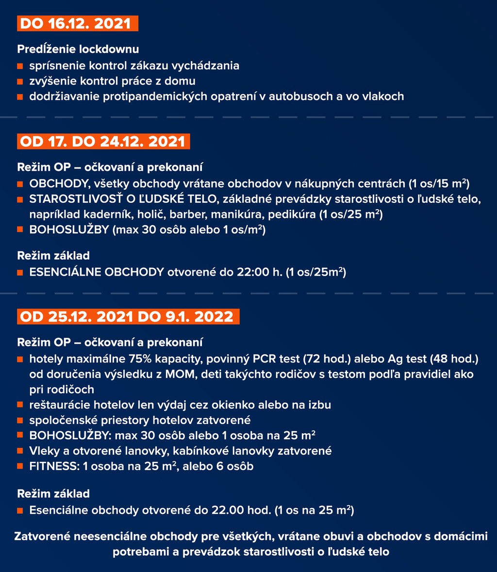 Vláda bude rozhodovať o podobe opatrení, ktoré zavedie v období pred Vianocami, počas sviatkov a po nich. Odborníci odporúčajú, aby sa lockdown uvoľnil týždeň pred Štedrým dňom. Znamená to, že by sa mohli otvoriť obchody pre očkovaných a prekonaných, teda fungovať v režime označenom ako OP.