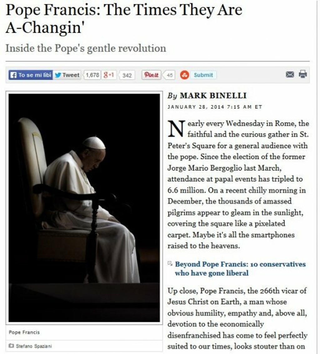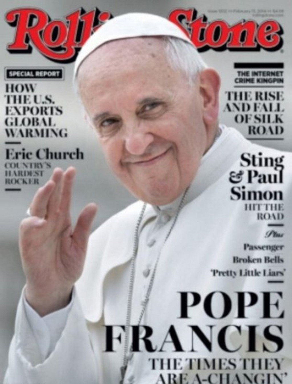 Americký časopis Rolling Stone sa rozhodol, že pápeža Františka uvedie do svojej siene slávy. Práve vďaka jeho "láskavej revolúcii". Na titulke ho "doprevádza" názov slávnej skladby od Boba Dylana The Times are Changing, ktorý sedí k obsahu článku. Ten je práve o pápežovej snahe priviesť cirkev do novej éry.