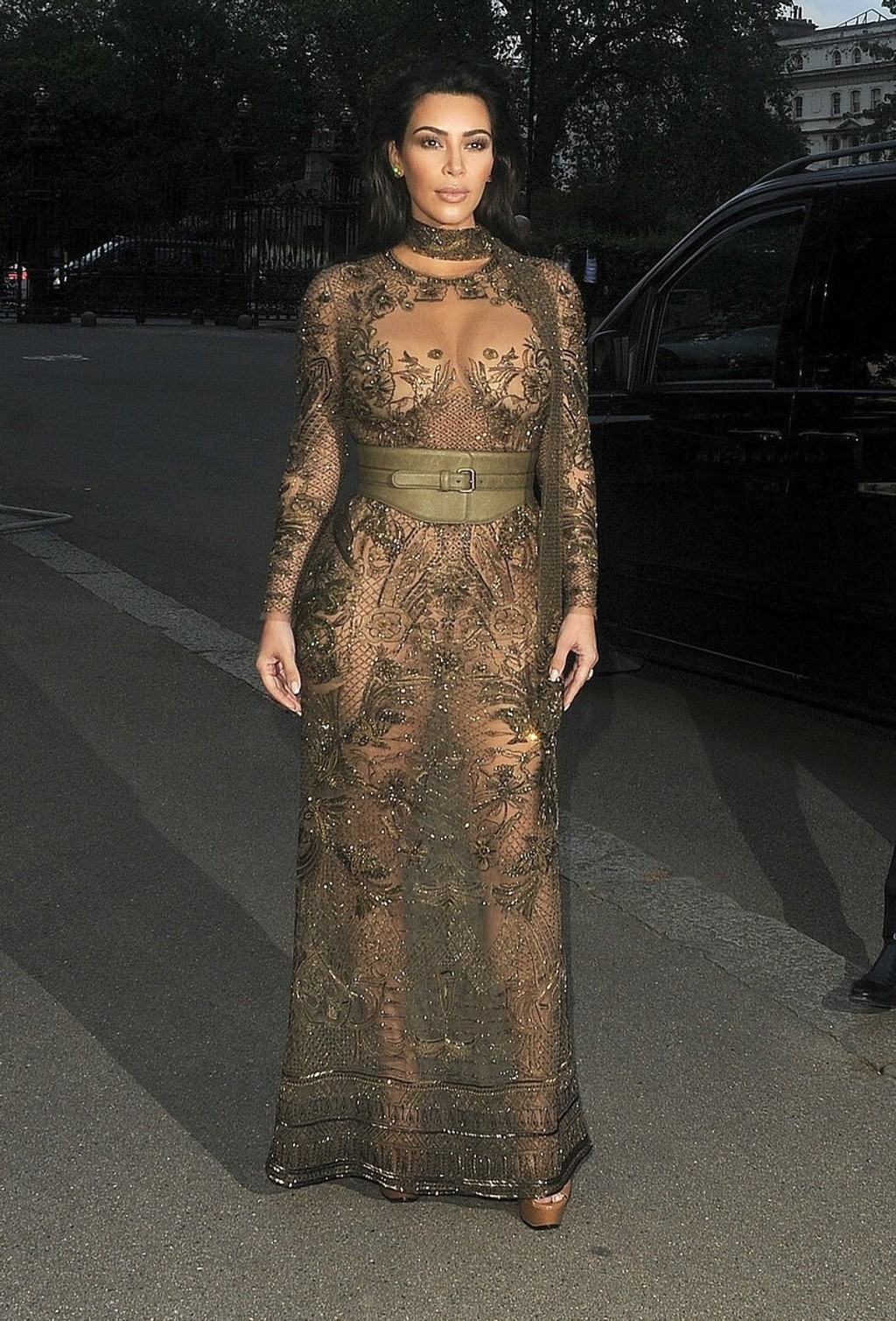 Do Londýna si obliekla veľmi rafinované šaty s čipkou. Vyzeralo to tak, ako keby pod nimi nič nemala. Ak sa ale lepšie pozriete, večerné šaty majú minimálne telovú podšívku vďaka ktorej pôsobia sexy, no nie vulgárne. Či má Kim niečo pod podšívkou, to už je otázne. Kanye bol celý v čiernom, len na nohách mal tie isté topánky ako na Met Gala.