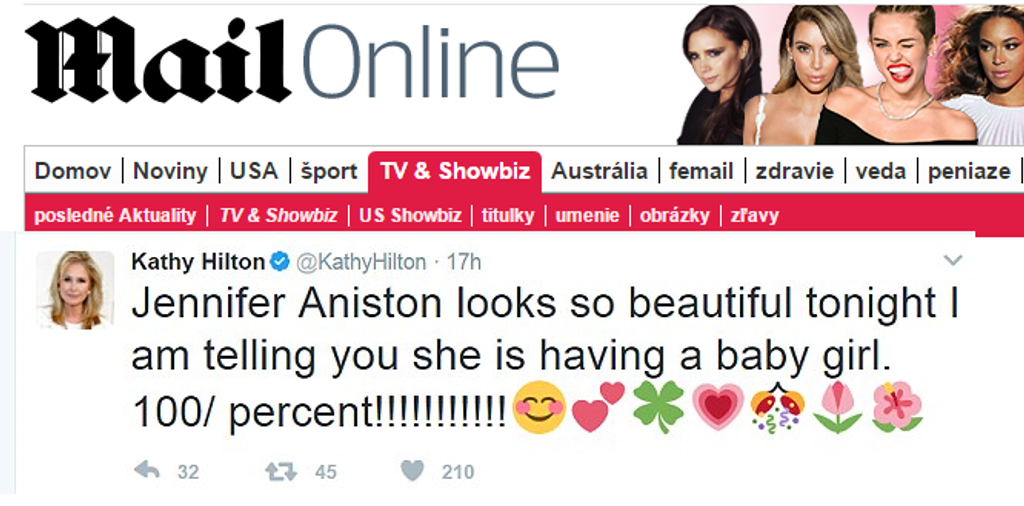 "Jennifer Aniston vyzerá dnes nádherne. Hovorím vám, že čaká dievčatko. Na 100 percent," napísala na Twitteri počas oscarovej noci matka Paris Hilton Kathy Hilton. Príspevok na sociálnej sieti ihneď vyvolal davové šialenstvo. Fanúšikovia krásnej 48-ročnej herečky boli nadšení a zaplavili ju gratuláciami.