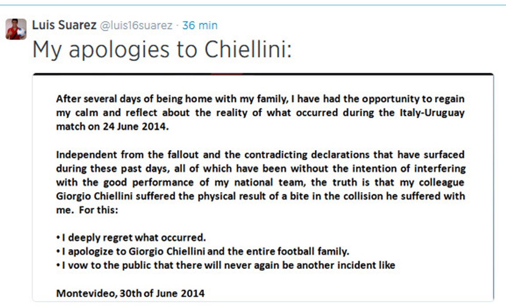 Suarez pôvodne poprel, že Taliana pohrýzol. S odstupom niekoľkých dní už konečne všetko priznal a uviedol, že svoj čin ľutuje. "Po niekoľkých dňoch, keď som bol doma so svojou rodinou, som mal príležitosť zhodnotiť a premyslieť si v pokoji, čo sa stalo v zápase Taliansko - Uruguaj 24. júna," napísal Suarez.