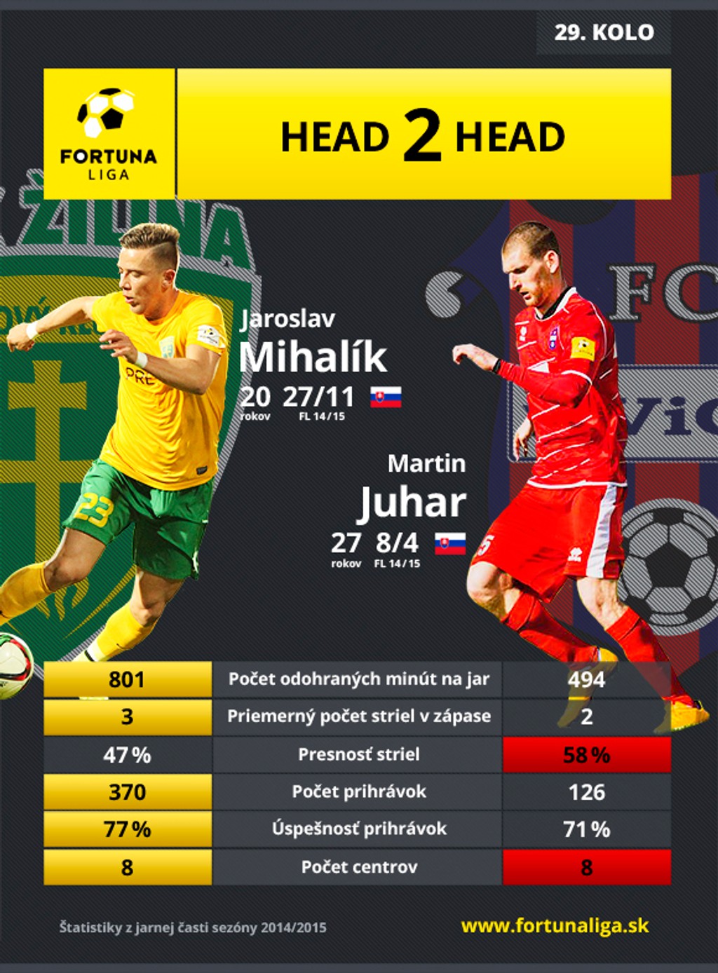 V rýchlom slede pokračuje futbalová Fortuna liga 2014/2015 zápasmi 29. kola, ktoré sú na programe v piatok a v sobotu. Kolo v piatok ponúkne päť duelov, skompletizuje ho sobotňajší televízny duel Žilina - Zlaté Moravce.