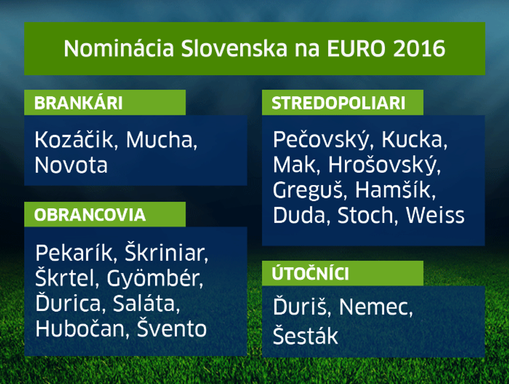Tréner Ján Kozák prezradil konečnú 23-člennú nomináciu na EURO 2016 vo Francúzsku. Pred odchodom na šampionát absolvuje jeho tím