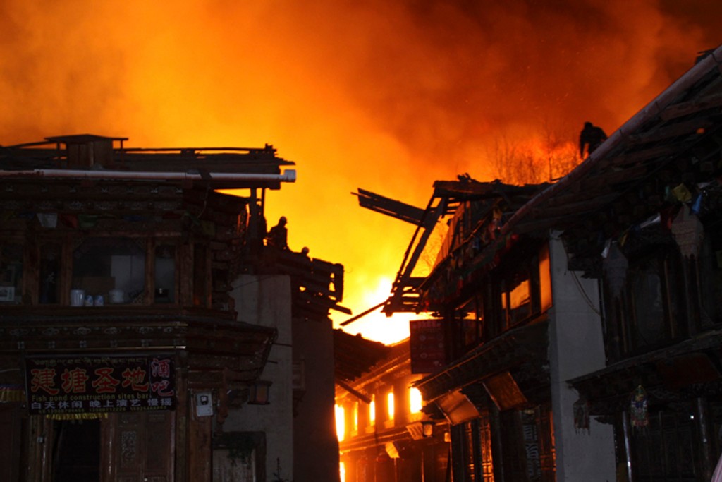 Požiar vypukol v sobotu nadránom a zničil viac ako sto tradičných drevených domov. Proti plameňom bojovalo viac ako tisíc hasičov a dobrovoľníkov, práce však komplikovalo veterné počasie. Požiar si podľa posledných informácií nevyžiadal žiadne obete, materiálne škody však údajne presiahli hranicu 100 miliónov jüanov (viac ako 12 miliónov eur).