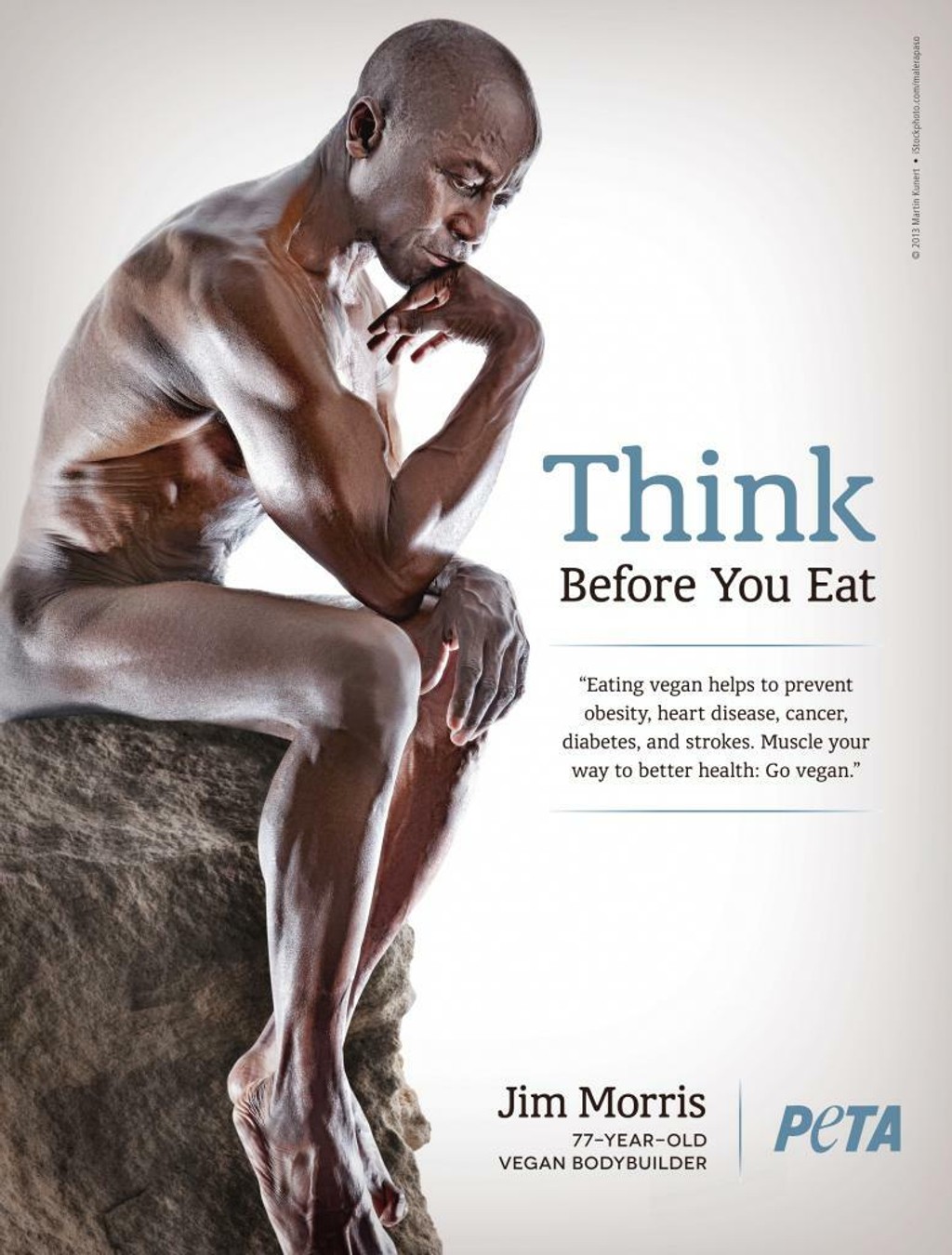 Volá sa Jim Morris a má 78 rokov. Na svoj vek vyzerá výborne. Fotografovi zapózoval celkom nahý, pričom záber dostal názov The Thinker (Mysliteľ). Sedí na kameni, rukou si podopiera bradu a premýšľa. Ide o novú kampaň spoločnosti PETA.