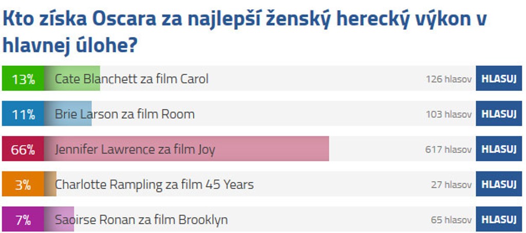 V kategórii Najlepší ženský herecký výkon v hlavnej úlohe u vás boduje herečka Jennifer Lawrence za snímku Joy. V ankete dostala 617 hlasov. Druhou kandidátkou na Oscara je Cate Blanchett za výkon vo filme Carol.