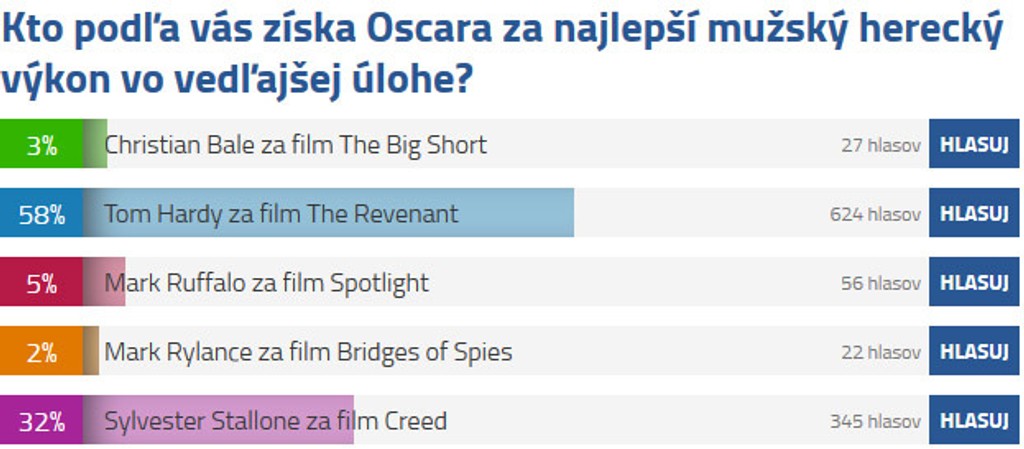Tesnejšie výsledky sú v ankete o Najlepší mužský herecký výkon vo vedľajšej úlohe. Podľa vás si tento rok odnesie Oscara Tom Hardy za snímku The Revenant. Dostal od vás 624 hlasov. Niektorí z vás by však doprali prestížne filmové ocenenie Sylvestrovi Stallonemu za výkon vo filme Creed.