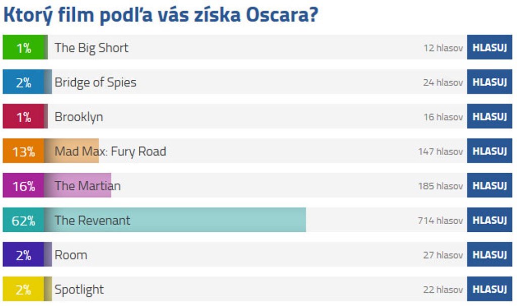 A ktorý film bol podľa vás v roku 2015 najlepší? Z ôsmych nominovaných snímok ste jednoznačne zvolili Revenanta s počtom hlasov 714. Druhým kandidátom na Oscara je The Martian (185 hlasov) a treťou snímkou, ktorej ste dávali hlasy je Mad Max: Fury Road (147).