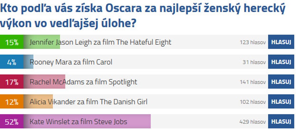 Najlepšou herečkou vo vedľajšej úlohe bude podľa vás Kate Winslet za výkon v snímke Steve Jobs. Dostala od vás 429 hlasov. Druhou kandidátkou je Rachel McAdams za snímku Spotlight s počtom hlasov 141.