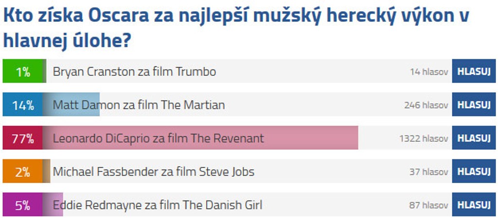 V kategórii Najlepší mužský herecký výkon v hlavnej úlohe ste mali jasno od začiatku. Najlepší výkon podľa vás podal Leonardo Dicaprio v snímke The Revenant s počtom hladov 1322. Druhý kandidát, ktorý má šancu na pozlátenú sošku je Matt Damon za výkon v snímke The Martian. Ten dostal 246 hlasov.