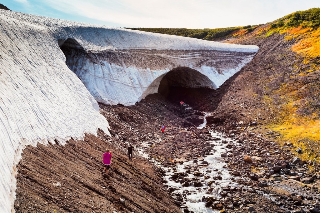 Slnečné lúče prechádzajú rôznou hrúbkou ľadovej steny a tým vznikajú pestré farby dúhy. Nádherné tunely v jaskyni vyhĺbil teplý prameň, ktorý ohrieva Mutnovskaja sopka. Tunel má približne jeden kilometer.