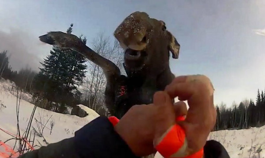 Mladej losej samici sa dočasné spútanie nepáčilo. Hneď, ako ju lovec pustil, zaútočila na neho. Všetko zachytila kamera, ktorú mal lovec nainštalovanú na hlave.