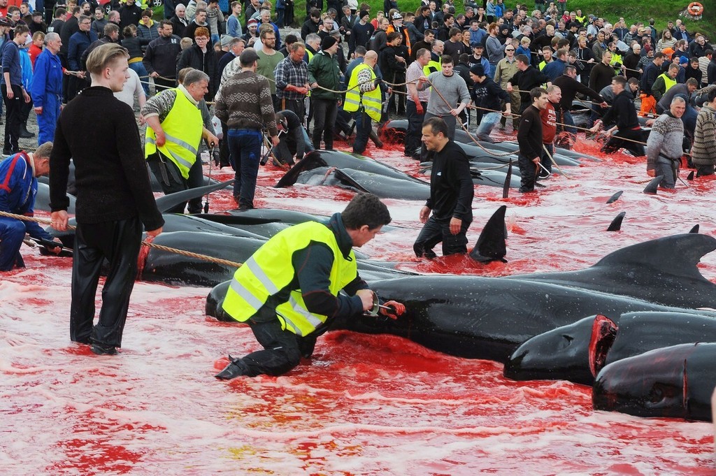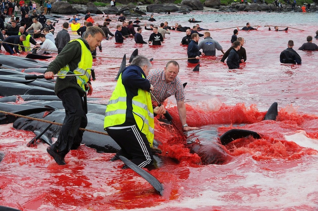 Všetko sledovali svedkovia, ktorí stáli pri pobreží aj obďaleč. Rituál spočíva v tom, že malé lode naženú veľryby a delfíny do plytkej zátoky a tam ich potom zarežú a snažia sa im poškodiť miechu, aby smrť nastala rýchlo.